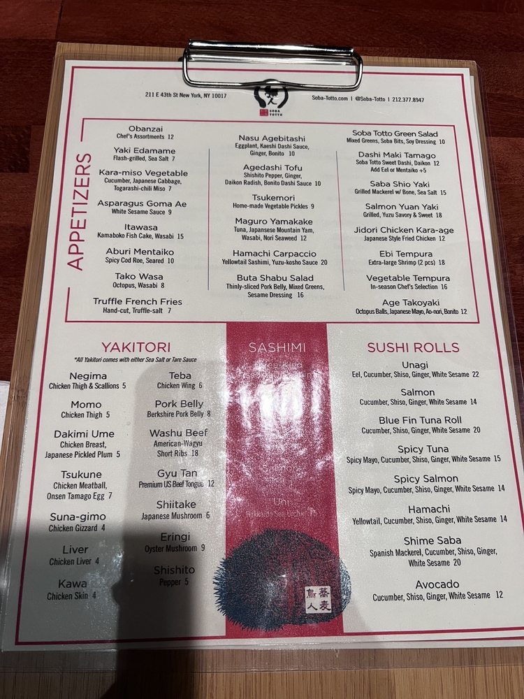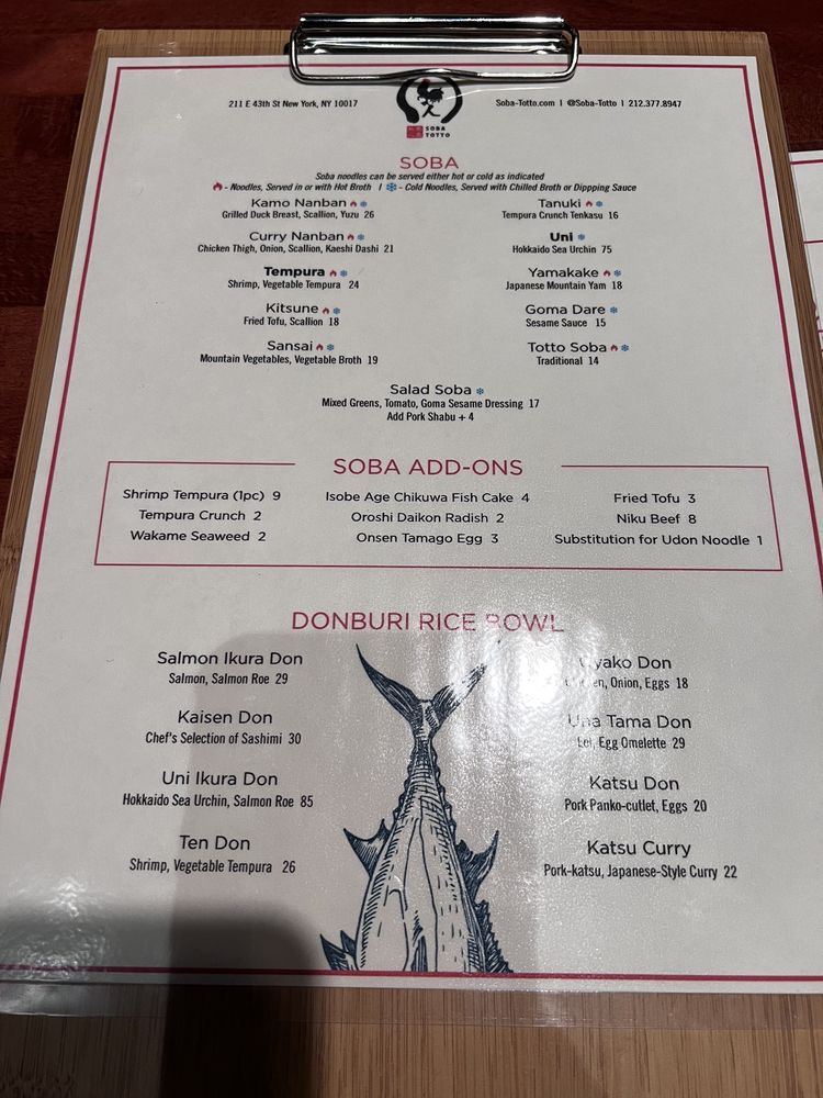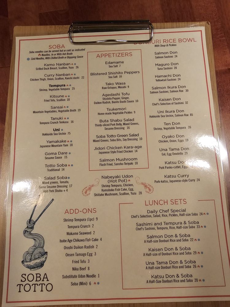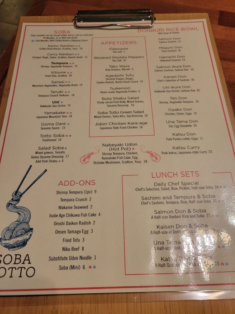 Soba Totto, located in New York, NY, offers a unique dining experience with its variety of Japanese dishes. The menu features lunch appetizers like Edamame Sea salt and Blistered Shishito Peppers, as well as Lunch Tempura Soba options including Assorted Tempura Soba and Tori Tempura Soba. The restaurant also serves Lunch Original Soba dishes like Niku Soba and Katsu Curry Soba. With a full bar, outdoor seating, and options for delivery and catering, Soba Totto caters to a diverse range of preferences. The atmosphere is casual yet vibrant, making it great for groups or a dinner out. Overall, Soba Totto offers a modern twist on traditional Japanese cuisine, providing a satisfying and memorable dining experience.